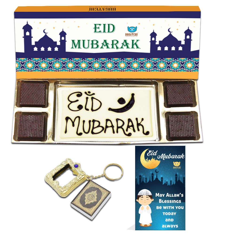 BOGATCHI EID Mubarak Gift Special Chocolate Box White EID Mubarak bar and 4 pcs + Free EID Mubarak Card + Free Pocket Quran