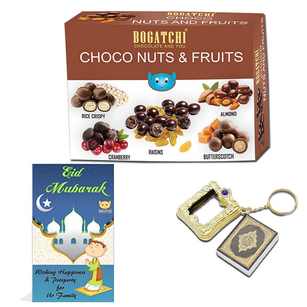 BOGATCHI EID Mubarak Gift Special Chocolate Coated Assorted Nuts and Fruits 100g + Free EID Mubarak Card + Free Pocket Quran