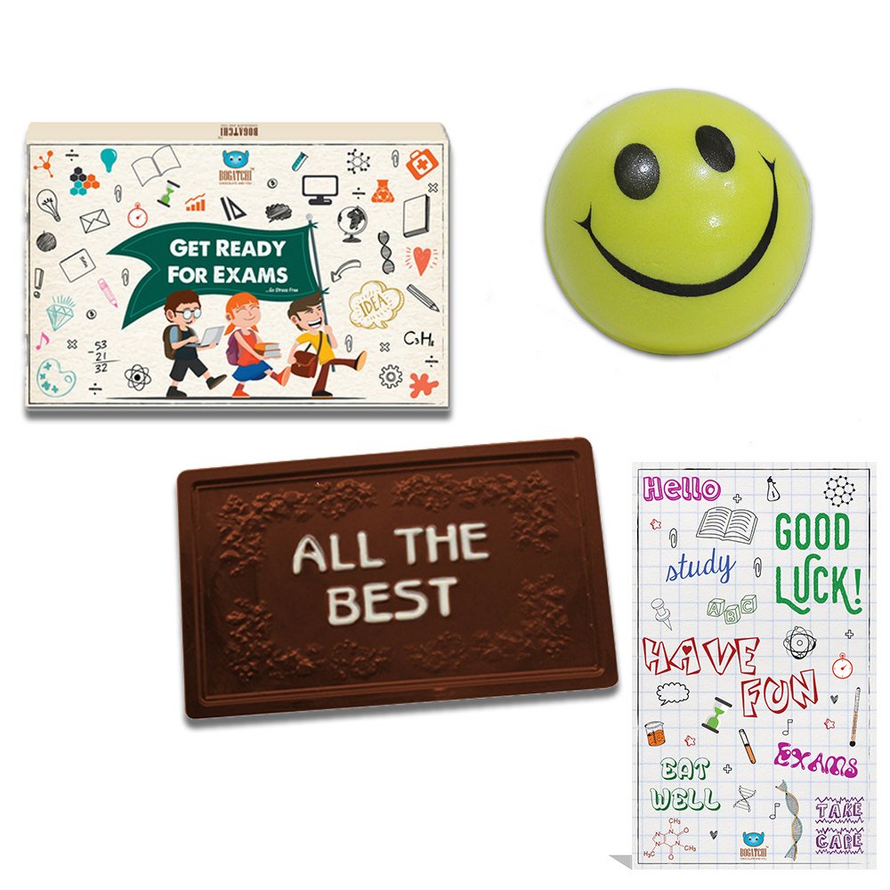 BOGATCHI Exam Day Gift EXAM Special Chocolate EXAM Gift Hamper Exam wishes All the Best Good Lucks Dark Chocolate Bar 70g + FREE -Smiley Ball (to control stress) + FREE Exam Wishes Greeting Card