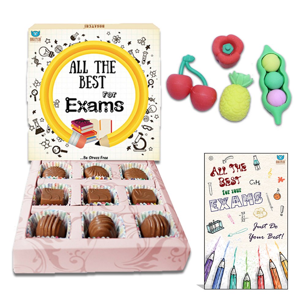 BOGATCHI Exam Day Gift EXAM Special Chocolates EXAM Gift Hamper Dark Chocolate for Exams 9 pcs + Free Fruit Shape Erasers (4pcs) + Free Exam Wishes Greeting Card