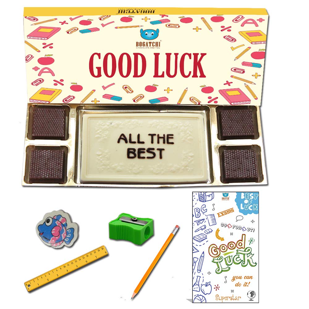 BOGATCHI Good Luck Chocolate Gift for Exams White Chocolae Bar + 4pcs Dark Chocolate + Free Good Luck Card + Exam Kit for Kids