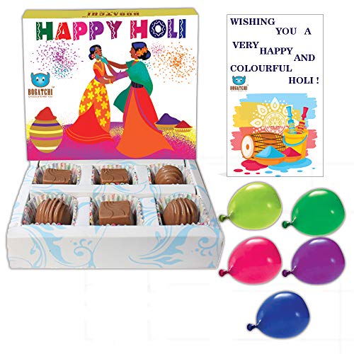 Bogatchi holi's day gift combo- Holi chocolates with card Holi chocolates with teddy Holi chocolates gift hamper Holi gift for her Holi gift for him. Colour of the Holi rang and balloons may change depending upon availability. Size of card is 3 inches x 5 inches