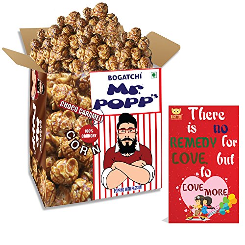 Bogatchi mr. Popp corn are handcrafted in old-fashioned copper kettles one batch at a time this popcorn is a crunchy and buttery caramel delight. Crafted in the india from quality ingredients. This caramelized popcorn is gluten-free cholesterol free and features non-gmo popcorn. It is high in dietary fiber and calcium. This caramel popcorn makes a great snack on the go for school work and home. Perfect snacks for movie time binge watching tv series marathon exam time snacking or just to make your self feel good. Bogatchi mr.Popp corn makes the best gift for celebration occasions like rakhi diwali anniversary birthday x-mas with loved ones. The chocolate caramel popcorn has dark chocolate dripped on the top of caramelized popcorn making these yummy. You will find chocolate on each and every bite of the popped corns. Enjoy with family and friends!
