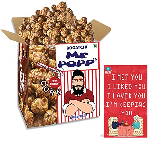 Bogatchi mr. Popp corn are handcrafted in old-fashioned copper kettles one batch at a time this popcorn is a crunchy and buttery caramel delight. Crafted in the India from quality ingredients. This caramelized popcorn is gluten-free cholesterol free and features non-gmo popcorn. It is high in dietary fiber and calcium. This caramel popcorn makes a great snack on the go for school work and home. Perfect snacks for movie time binge watching tv series marathon exam time snacking or just to make your self feel good. Bogatchi mr.Popp corn makes the best gift for celebration occasions like rakhi diwali anniversary birthday x-mas with loved ones. The chocolate caramel popcorn has dark chocolate dripped on the top of caramelized popcorn making these yummy. You will find chocolate on each and every bite of the popped corns. Enjoy with family and friends!