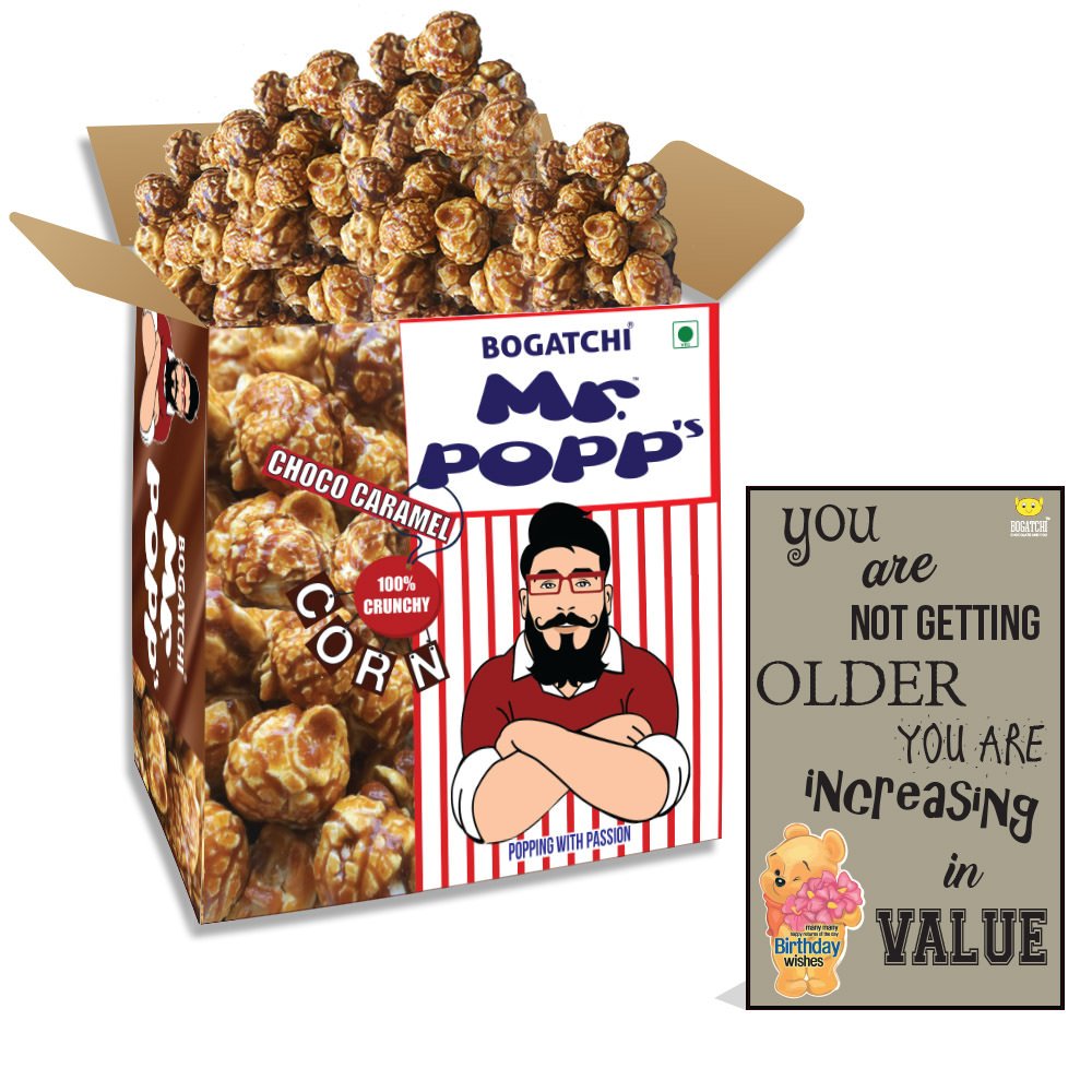 Bogatchi mr. Popp corn are handcrafted in old-fashioned copper kettles one batch at a time this popcorn is a crunchy and buttery caramel delight. Crafted in the India from quality ingredients. This caramelized popcorn is gluten-free cholesterol free and features non-gmo popcorn. It is high in dietary fiber and calcium. This caramel popcorn makes a great snack on the go for school work and home. Perfect snacks for movie time binge watching tv series marathon exam time snacking or just to make your self feel good. Bogatchi mr.Popp corn makes the best gift for celebration occasions like rakhi diwali anniversary birthday x-mas with loved ones. The chocolate caramel popcorn has dark chocolate dripped on the top of caramelized popcorn making these yummy. You will find chocolate on each and every bite of the popped corns. Enjoy with family and friends!