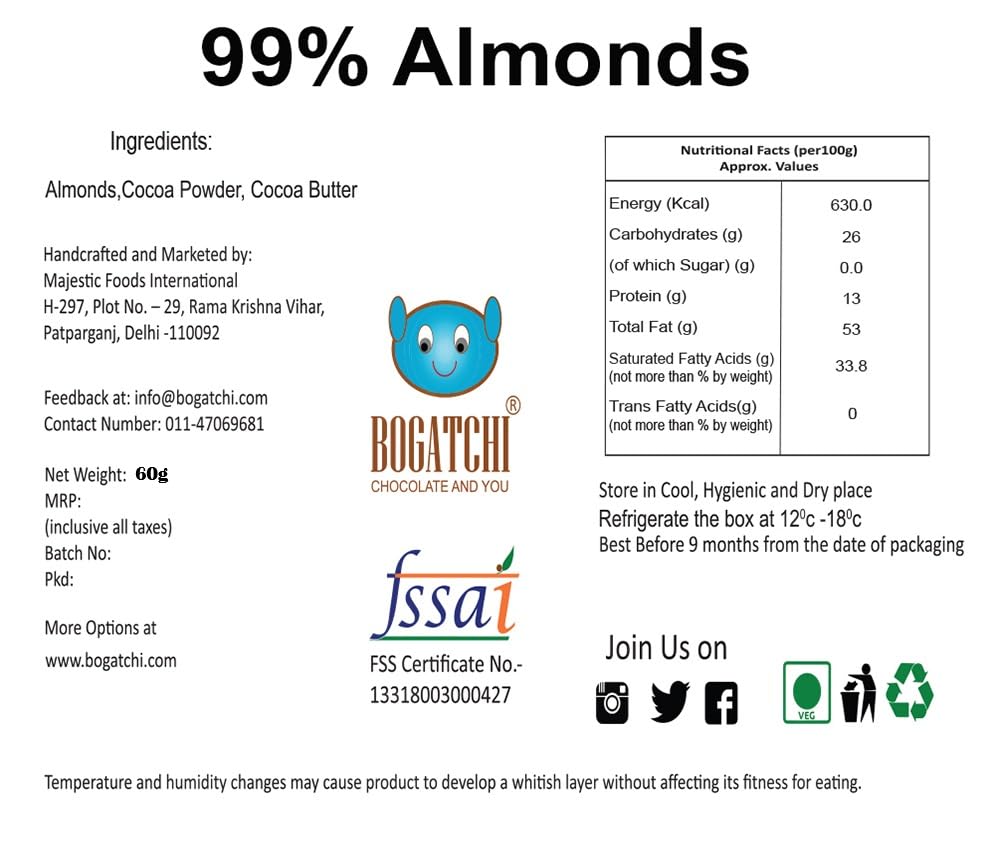 Bogatchi 99% dark chocolate provides best quality dark chocolate experience with real cocoa content. These are intense dark chocolate for true chocolate lovers. Perfect choice for dark chocolate enthusiasts. Comes loaded with almonds