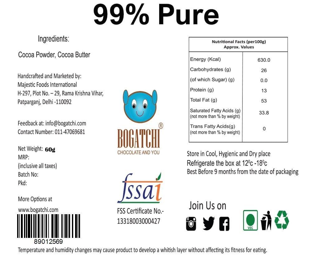 Bogatchi 99% dark chocolate provides best quality dark chocolate experience with real cocoa content. These are intense dark chocolate for true chocolate lovers. Perfect choice for dark chocolate enthusiasts.