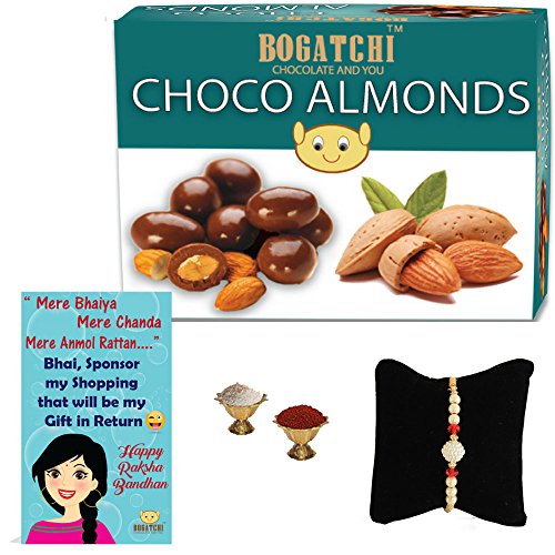 BOGATCHI Rakhi Chocolate Gift Hamper for Brother Chocolate Coated Almonds 100g + Free Rakhi Greeting Card + Free Rakhi + Roli Chawal