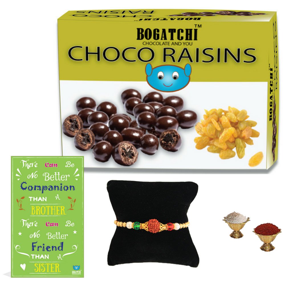 BOGATCHI Rakhi Chocolate Gift Hamper for Brother Chocolate Coated Raisins 100g + Free Rakhi Greeting Card + Free Rakhi + Roli Chawal
