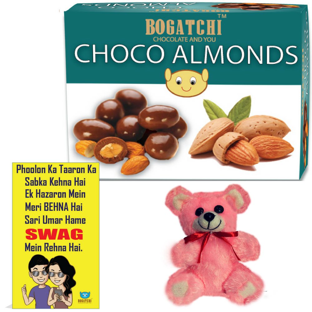 BOGATCHI Rakhi Chocolate Gift Hamper for Sister Chocolate Coated Almonds 100g + Free Rakhi Greeting Card + Free Teddy