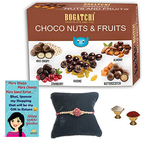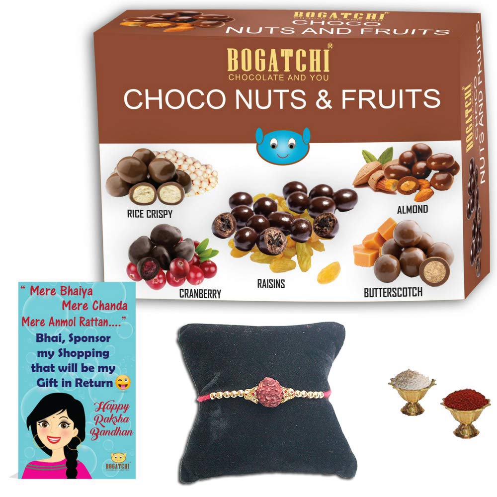 The product is a bogatchi pack of chocolate coated assorted dry fruits and nuts greeting card rakhi and roli chawal. The exotic flavours of chocolate are sure to tickle your taste buds. These chocolates are perfect for the any age group who are young at heart. These chocolates are just the right gift for any season. This is an amazing gift to send to your girlfriend boyfriend brother sister or parents. Send these gifts to your near ones and surprise them.