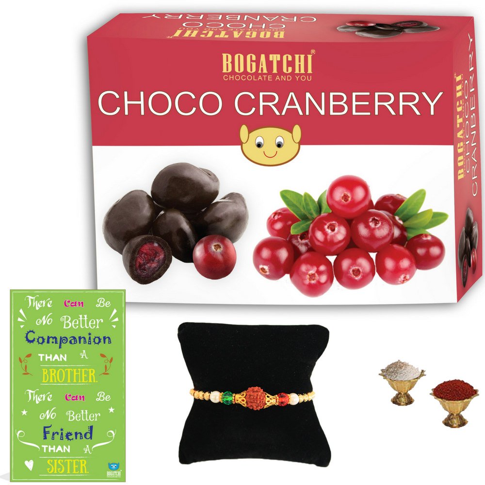 BOGATCHI Rakhi Chocolate Gift Pack for Brother Chocolate Coated Cranberry 100g + Free Rakhi Greeting Card + Free Rakhi + Roli Chawal