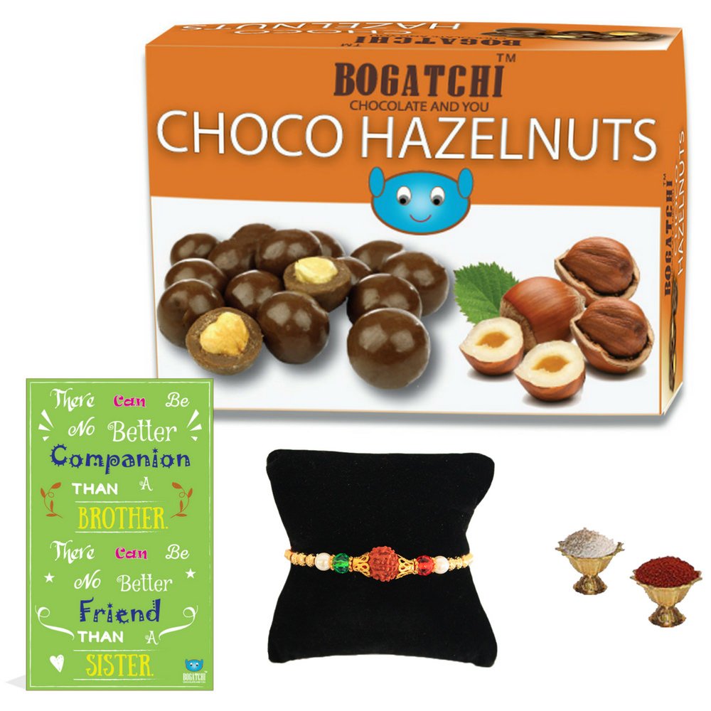 BOGATCHI Rakhi Chocolate Gift Pack for Brother Chocolate Coated Hazelnut 100g + Free Rakhi Greeting Card + Free Rakhi + Roli Chawal