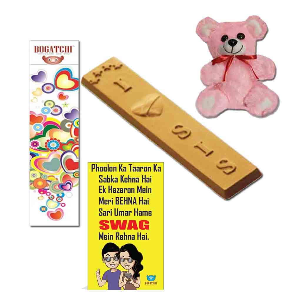 BOGATCHI Rakhi Gift for Sister I Love Sis Chocolate Bar 1 pcs + Teddy + Free Rakhi Card