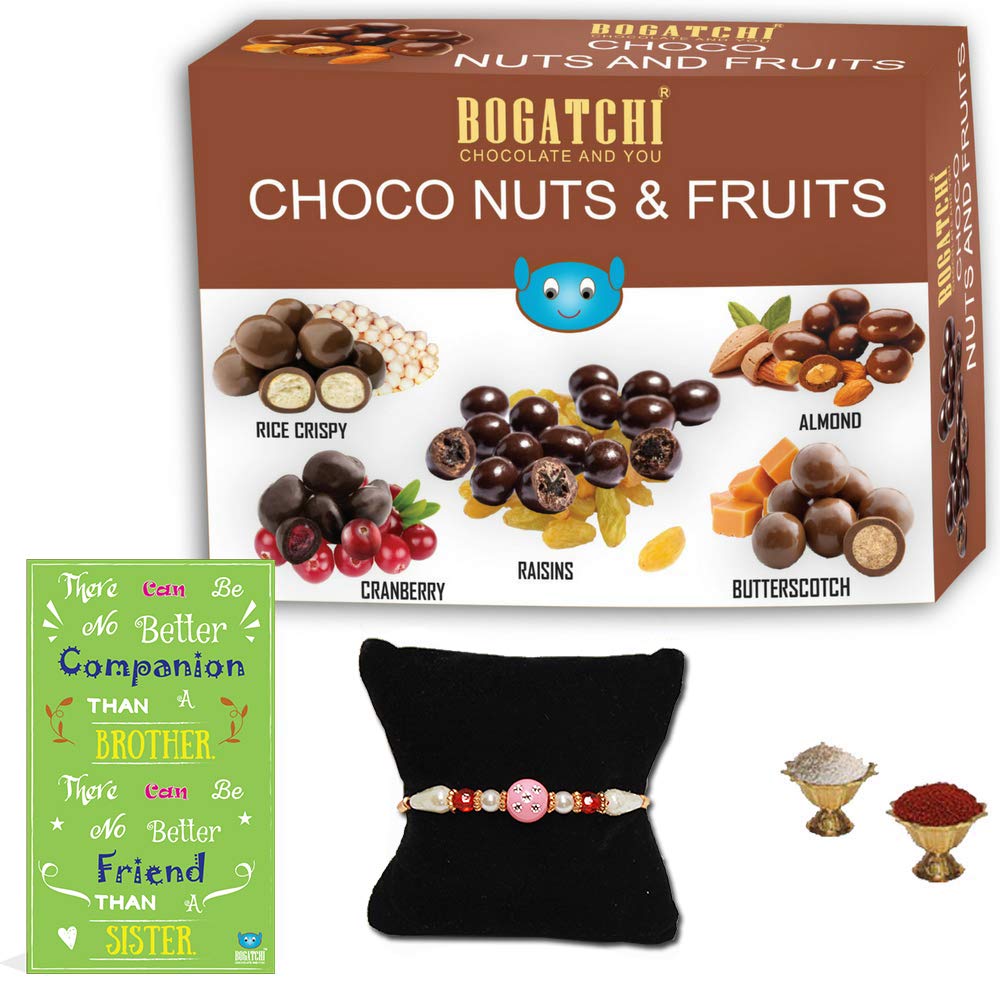 BOGATCHI Rakhi Special Rich Dry Collection Gift for Brother Chocolate Coated Assorted Nuts and Fruits 100g + Free Rakhi Greeting Card + Free Rakhi + Roli Chawal