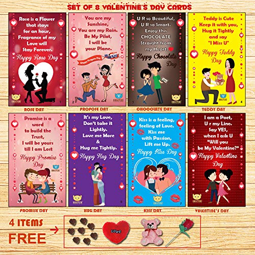BOGATCHI Set of 8 Creative Valentine's Cards for Girlfriend Wife Husband Boyfriend + Free Heart Chocolates + Free Rose + Free Teddy + Free Fur Heart Celebrate Valentines Week