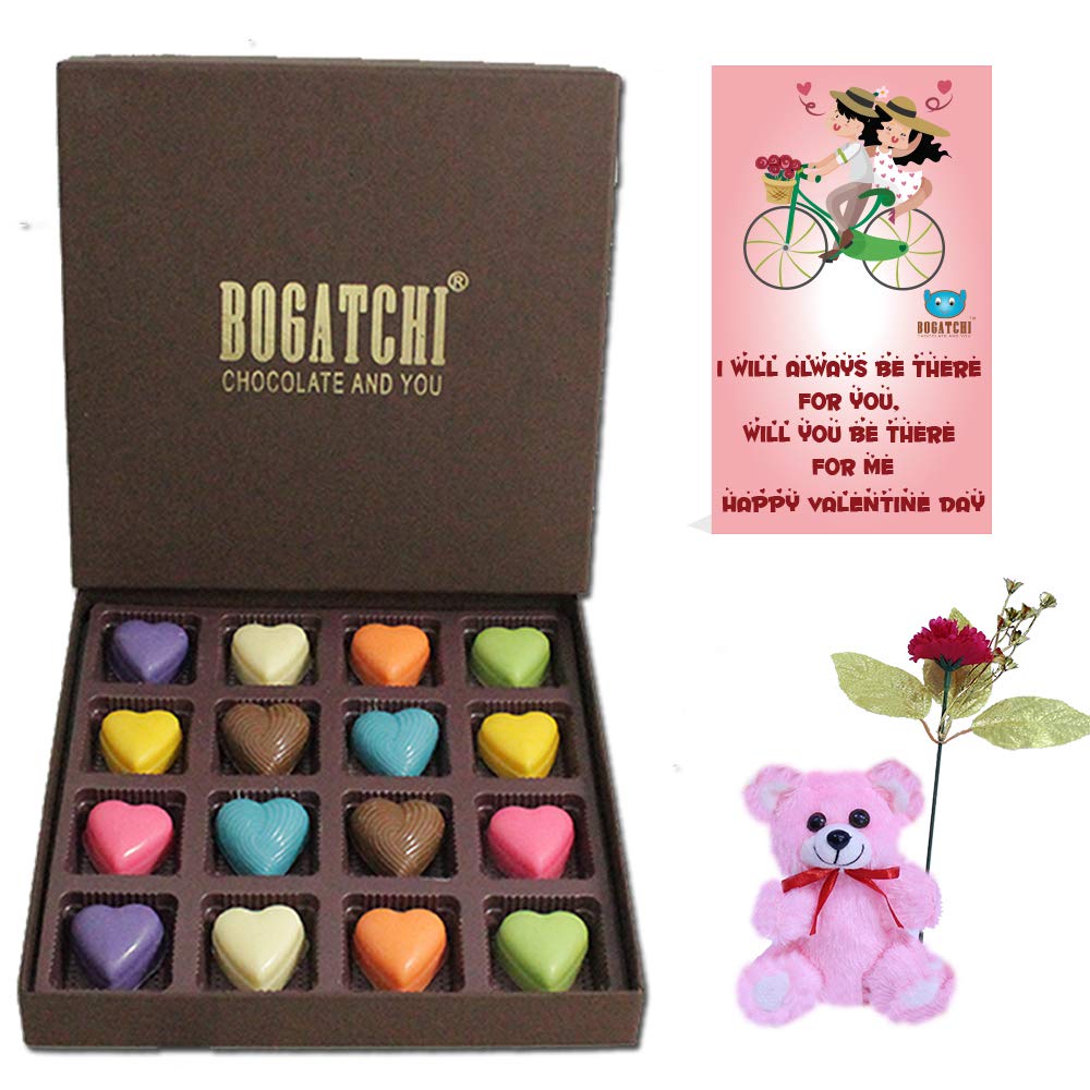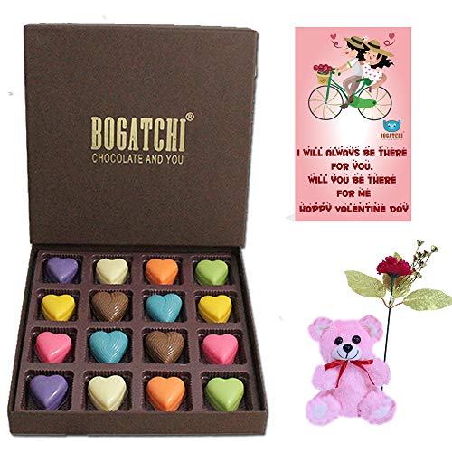 BOGATCHI Valentine Chocolate Hearts for Girlfriend- Boyfriend- Wife - Husband 16pcs + Free Valentines Day Card with Rose and Teddy