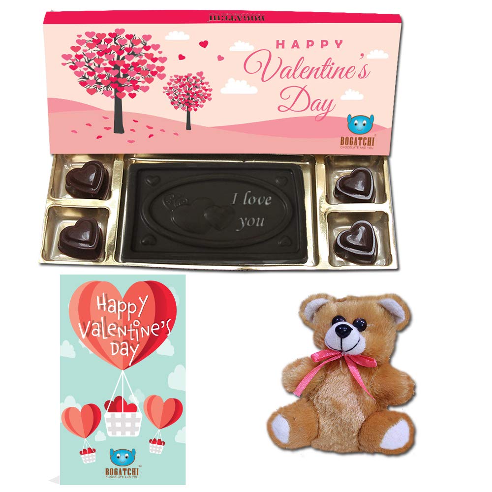BOGATCHI Valentine Chocolates Gift Box for Husband I Love You Bar + 4 Chocolae Hearts + Free V-Day Card + Free Teddy
