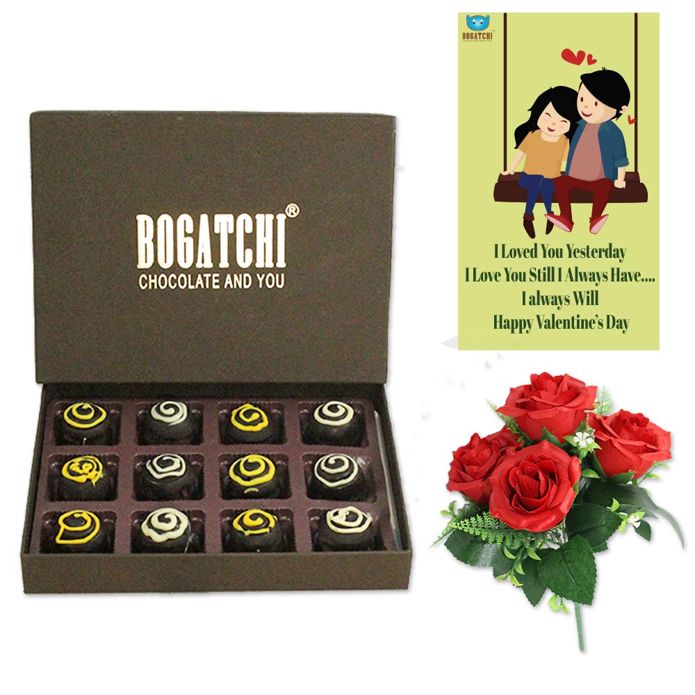 HomeGrocerySweetsChocolatesBOGATCHI Valentine Day Chocolate Gift for Girlfriend- Boyfriend- Wife- Husband 12pcs Chocolate Truffles + Free Valentines Day Story Cards and Rose Bouquet