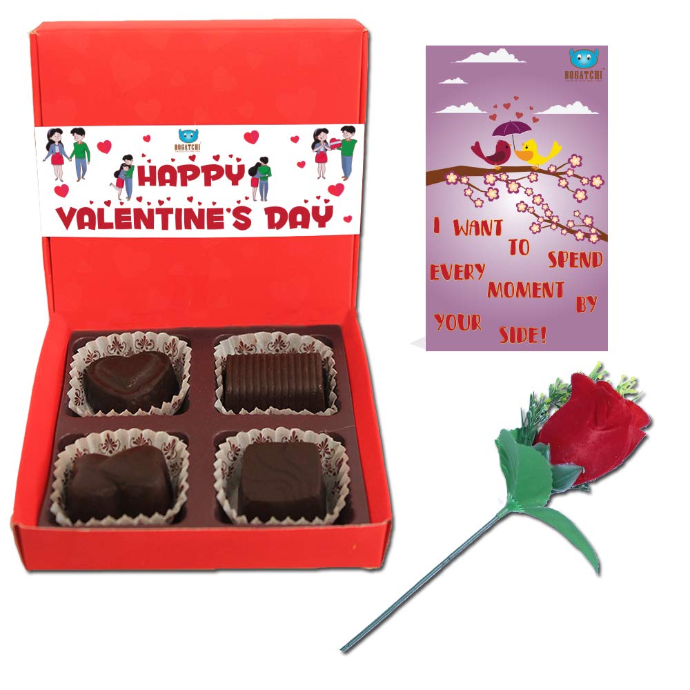 BOGATCHI Valentines Day Chocolate Gift 4 Choco Red Box + Free V-Day Card + Free Rose