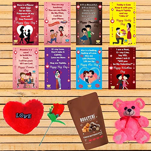 BOGATCHI Valentines Day Chocolate Gift Choco Butterscotch or Rice Crispy 50g+ Free All Days Cards + Teddy + Fur Heart + Rose Celebrate Valentines Week