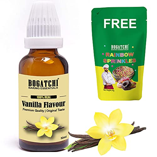 BOGATCHI Vanilla Flavour Essence for Baking Cakes Cookies Chocolates Ice Creams Desserts | Professional Quality | Original Taste | Sugar-Free | 30ML | FREE Rainbow Sprinkles 50g