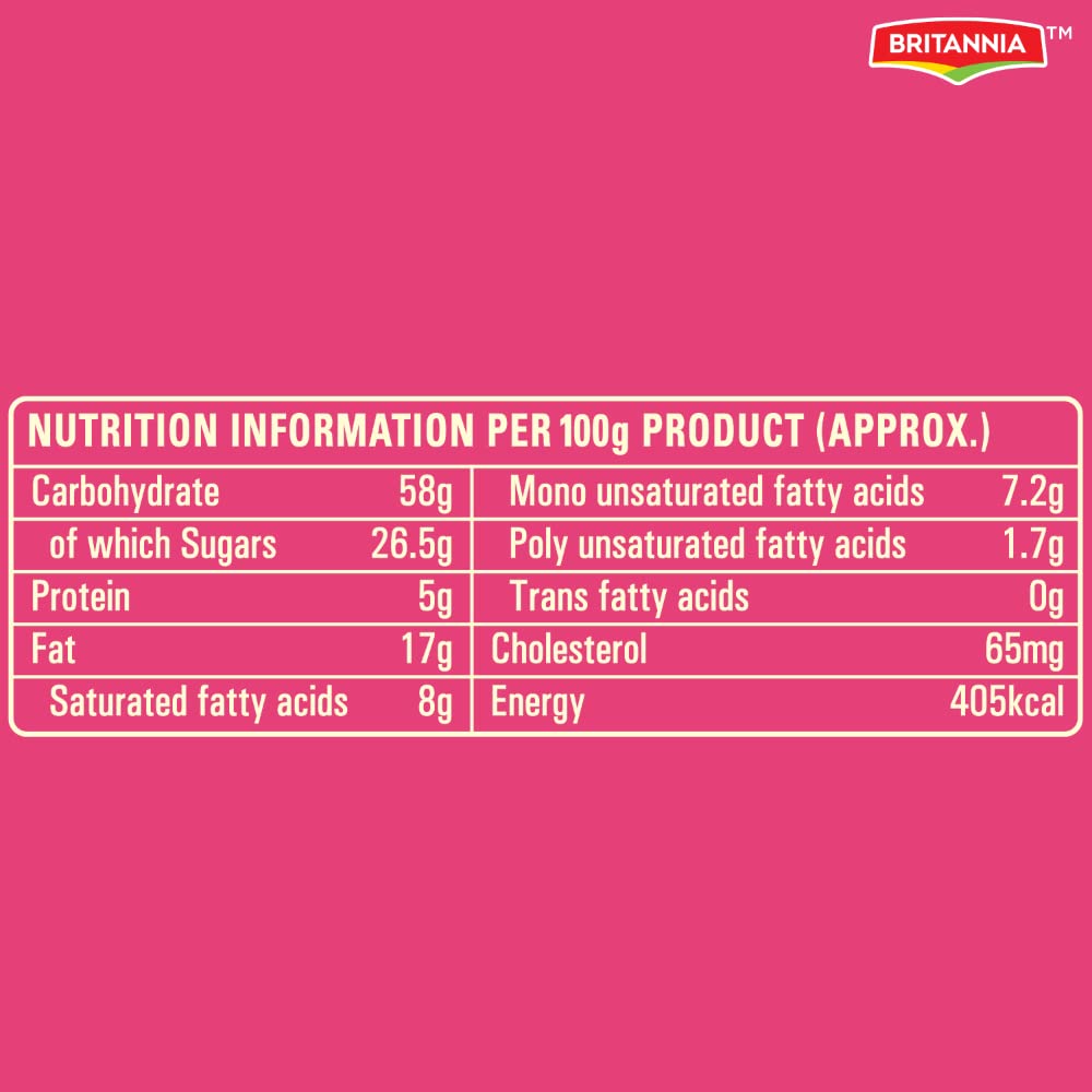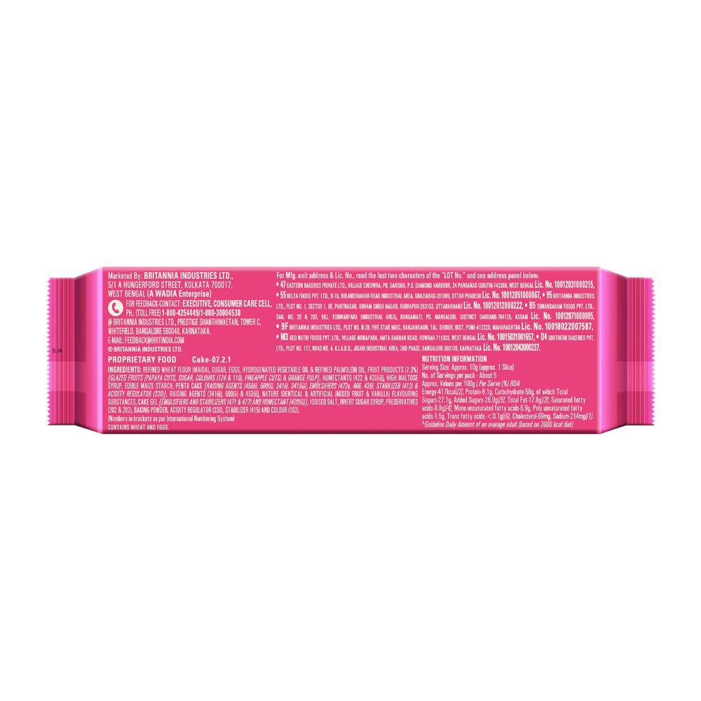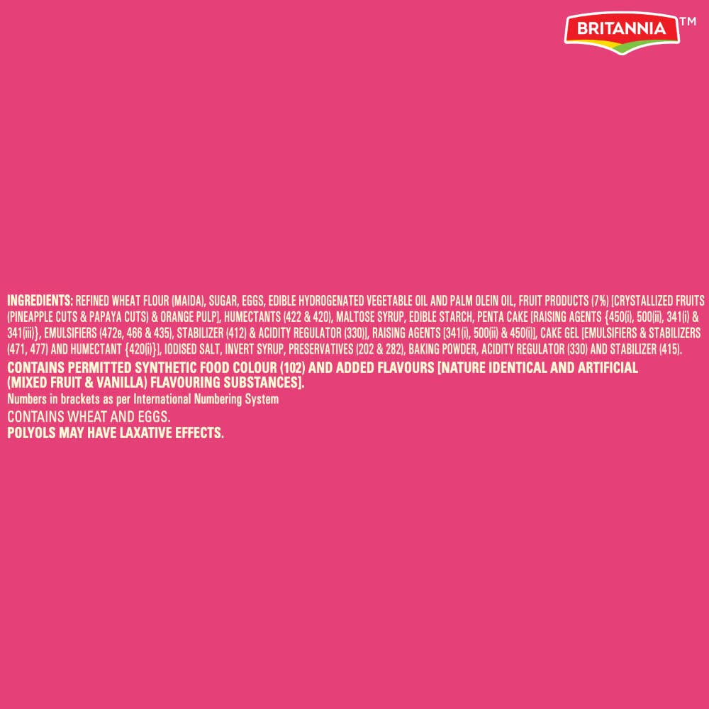 Britannia Fruit Cake has soft and delicious cake slices with the goodness of little fruit bits milk and eggs. With the best all-natural ingredients each bite gives mouth-watering flavour. Britannia Cakes have soft spongy and fluffy slices that deliciously melts in your mouth. Believing in delivering fresh and healthy products Britannia India manufactures some of India's favourite cakes.