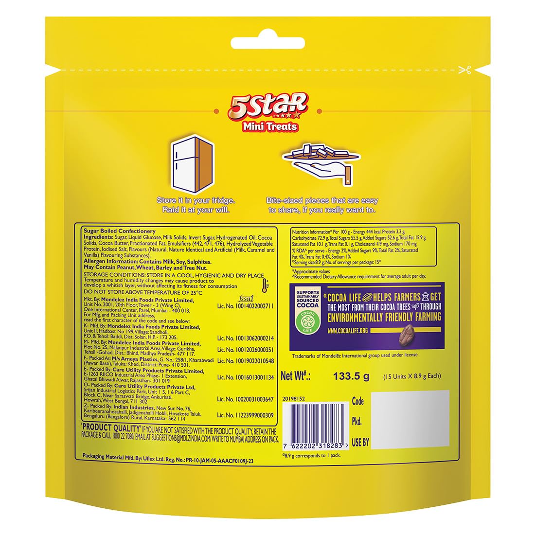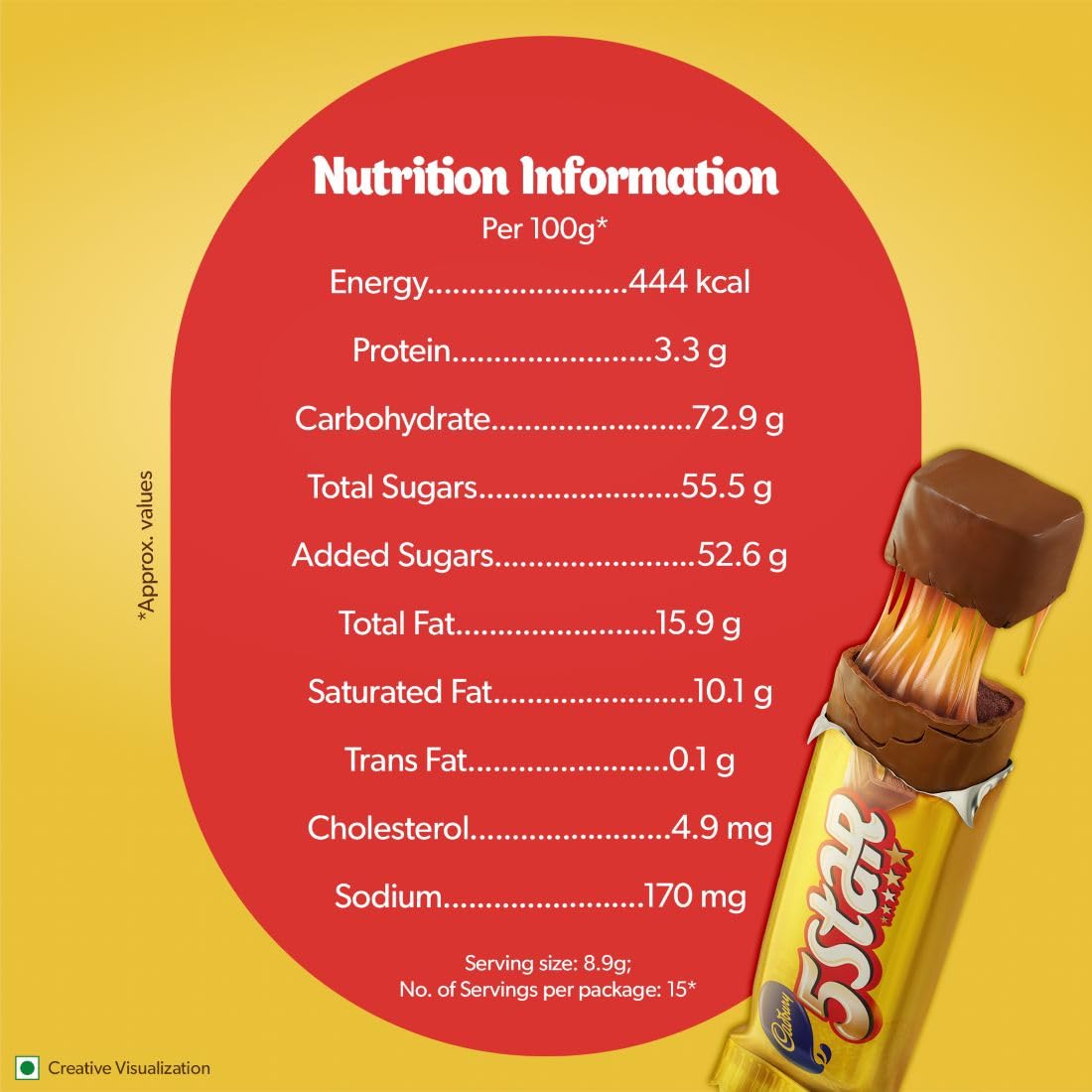 • Indulge in Five Star chocolate a smooth textured caramel chocolate. Dive into the chocolaty creamy centre of this Cadbury milk chocolate and get lost in the long-lasting chewy experience of melted caramel & nougat.