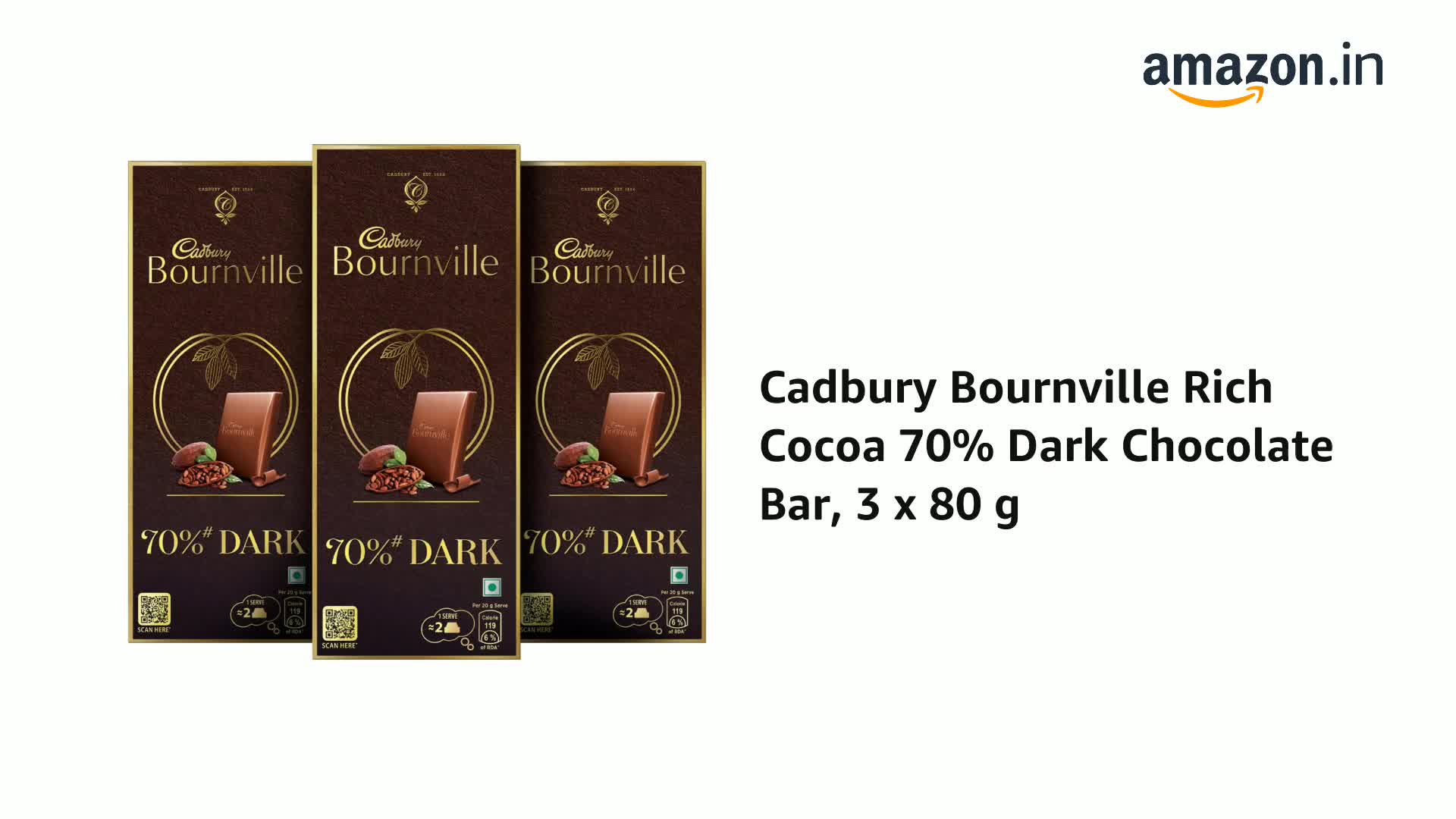 Cadbury Bournville Rich Cocoa 70% Dark Chocolate Bar, 75 Gm (Pack Of 3)