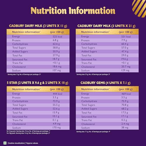 • This assorted chocolates gift pack contains 3 units of Cadbury Dairy Milk Chocolate-23g 2 units of Cadbury 5 Star-20g 3 units of Gems-7.9g 3 units of Cadbury Dairy Milk Chocolate -12g 1 unit of 5 Star-10.1g.Just like every bar of Cadbury Dairy Milk this i