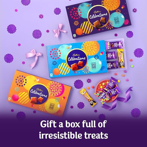 Kuch achha ho jaaye kuch meetha ho jaaye with Cadbury Celebrations. Filled with the goodness of Cadbury chocolates the perfect gift for those whose presence makes every occasion perfect. Made with love a chocolate box meant for every occasion-a Rakhi gift for your brother or sister a special one's Birthday Diwali with family create moments to cherish with Cadbury. This assorted chocolates gift pack contains 3 units of Cadbury Dairy Milk Chocolate-23g 2 units of Cadbury 5 Star-20g 3 units of Gems-7.9g 3 units of Cadbury Dairy Milk Chocolate -12g 1 unit of 5 Star-10.1g.Perfect for gifting your loved ones on every occasion. Store this in a cool dry and hygienic place as per back of pack instructions. Just like every bar of Cadbury Dairy Milk this is suitable for vegetarians.
