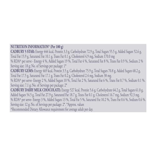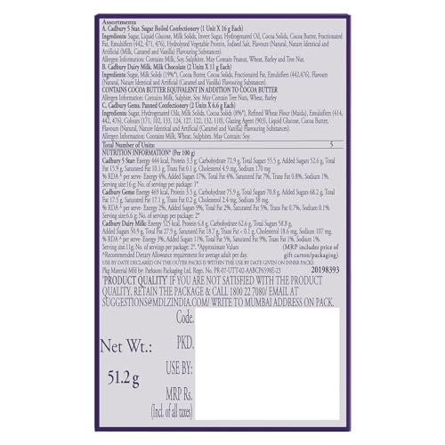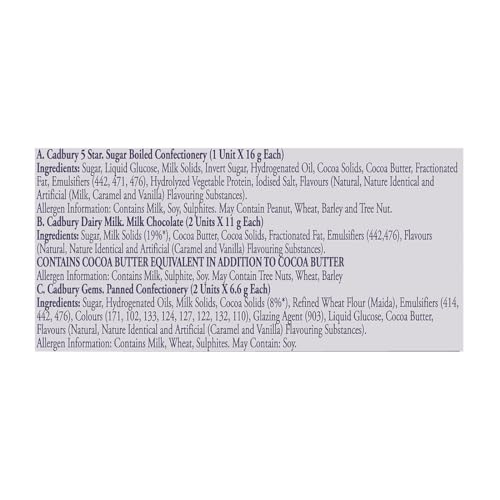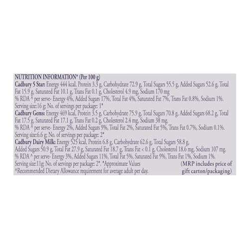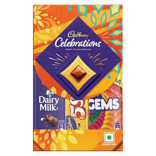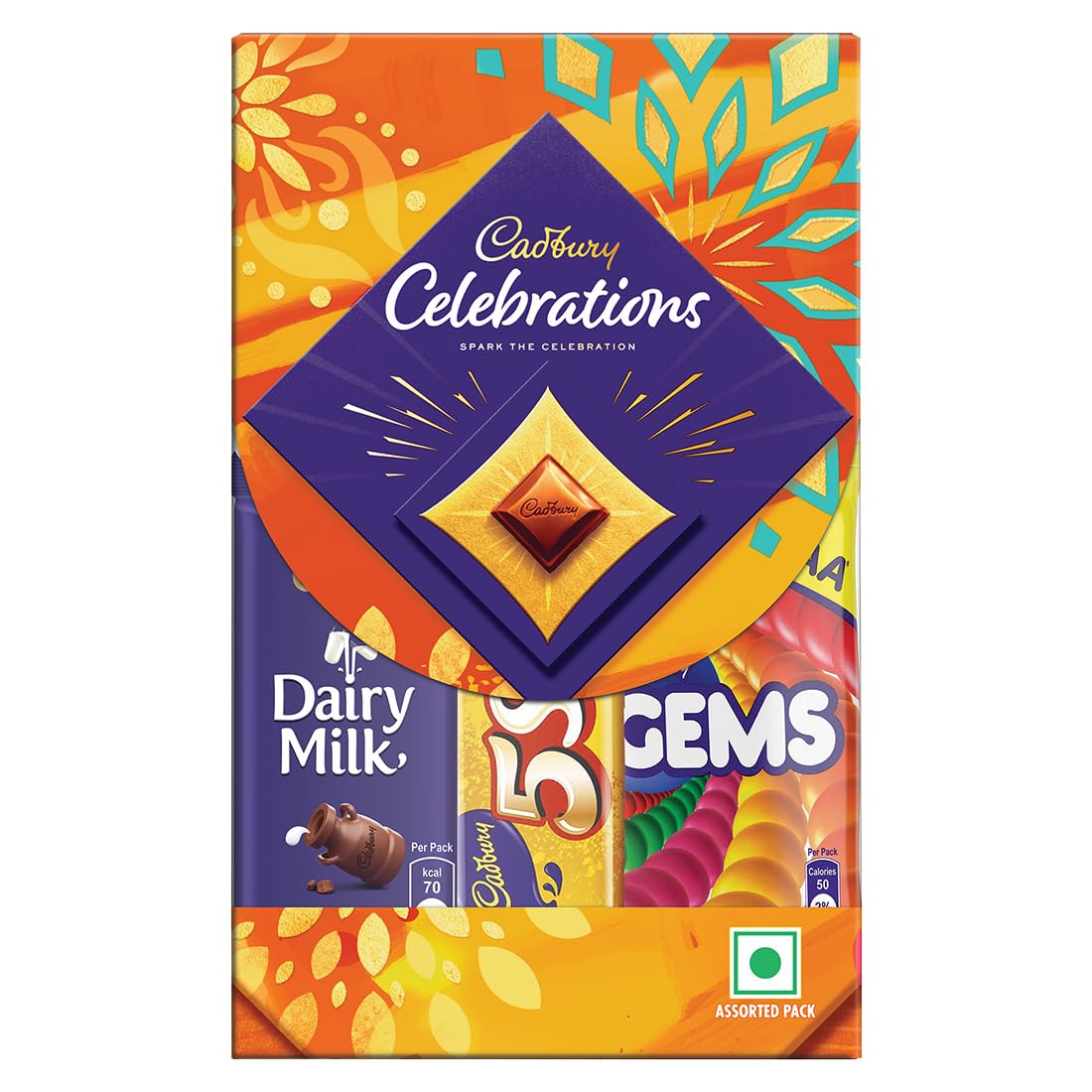 Kuch achha ho jaaye kuch meetha ho jaaye with Cadbury Celebrations. Filled with the goodness of Cadbury chocolates the perfect gift for those whose presence makes every occasion perfect. Made with love a chocolate box meant for every occasion-a Rakhi gift for your brother or sister a special one's Birthday Diwali with family create moments to cherish with Cadbury. This assorted chocolates gift pack contains 1 Unit of Cadbury 5 Star -20g 2 Units of Cadbury Gems -7.9g 2 Units of Cadbury Dairy Milk Chocolate -12g.Perfect for gifting your loved ones on every occasion. Store this in a cool dry and hygienic place as per back of pack instructions. Just like every bar of Cadbury Dairy Milk this is suitable for vegetarians.
