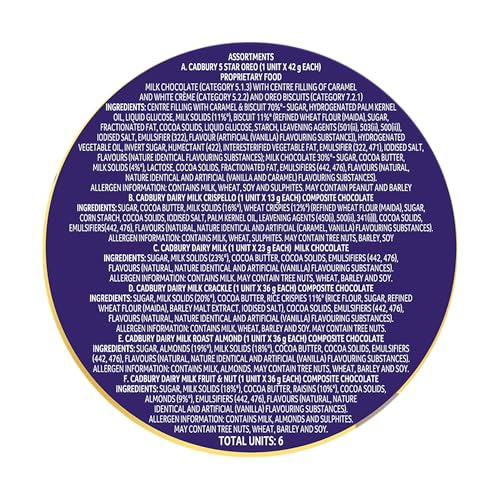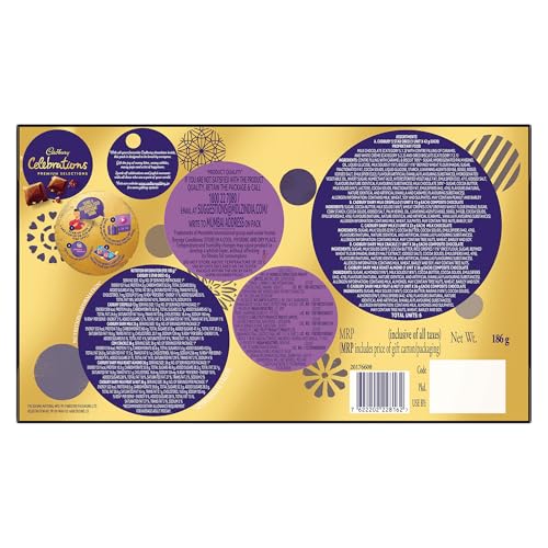 Kuch achha ho jaaye kuch meetha ho jaaye with Cadbury Celebrations. Filled with the goodness of Cadbury chocolates the perfect gift for those whose presence makes every occasion perfect. Made with love a chocolate box meant for every occasion-a Rakhi gift for your brother or sister a special one's Birthday Diwali with family create moments to cherish with Cadbury. This assorted chocolates gift pack contains 1 unit of Cadbury 5 Star Oreo - 42 g 1 unit of Crispello - 13 g 1 unit of Cadbury Dairy Milk - 23 g 1 unit of Crackle - 36 g 1 unit of Cadbury Dairy Milk Roast Almond - 36 g 1 unit of Cadbury Dairy Milk Fruit & Nut - 36 g. Perfect for gifting your loved ones on every occasion. Store this in a cool dry and hygienic place as per back of pack instructions. Just like every bar of Cadbury Dairy Milk this is suitable for vegetarians.