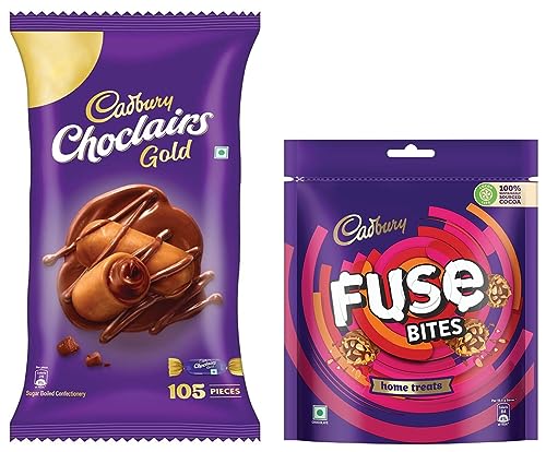 Cadbury Choclairs Gold (605g /577.5g grammage may vary)Bring home your favourite Cadbury Choclairs Gold in a super saver family pack. It will take care of all your sweet cravings be it small moments of self indulgence or fun with friends and family. The rich Cadbury chocolate filling in a delicious caramel casing will just leave you wanting for moreCadbury Fuse Peanut & Caramel filled Chocolate Home Treats 108.5gA delicious fusion of crunchy peanuts sweet caramel and a creamy centre all coated in smooth Cadbury milk chocolate. A chocolaty feast that stimulates your taste buds and satisfies you.