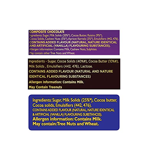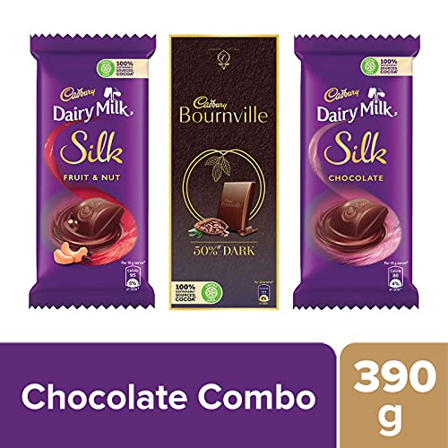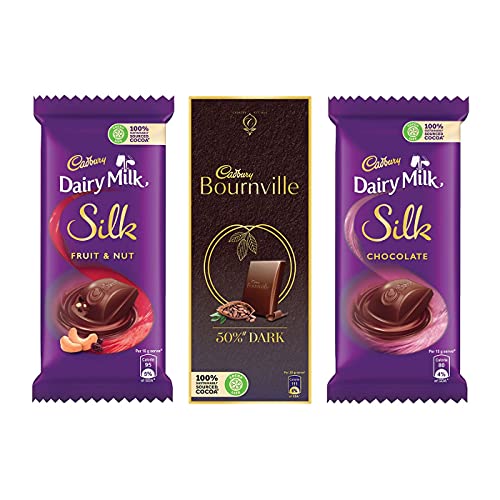 Cadbury is all about regaling in the chocolate's richness and creaminess. It offers you the reason to celebrate every small and big occasion of happiness. In short indulge in a rich smooth and creamy celebration. This combo comprises 2 packs of Cadbury Dairy Milk Silk 60g 2 packs of Cadbury Dairy Milk Silk Fruit and Nut 55g & 2 packs of Cadbury Bournville Rich Cocoa 80g.