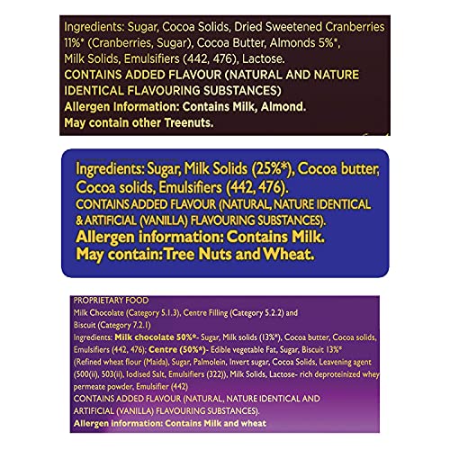 Cadbury is all about regaling in the chocolate's richness and creaminess. It offers you the reason to celebrate every small and big occasion of happiness. In short indulge in a rich smooth and creamy celebration. This combo comprises 2 packs of Cadbury Dairy Milk Silk 60g 2 packs of Cadbury Dairy Milk Silk Oreo 60g & 2 packs of Cadbury Bournville Cranberry 80g.