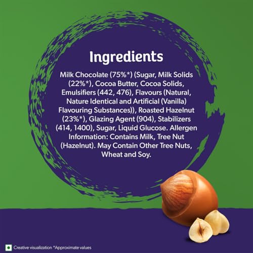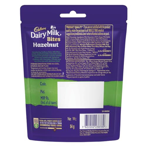 Introducing Cadbury Dairy Milk Bites - a bite sized chocolate snack packed with premium crunchy roasted whole hazelnut coated with your favourite signature Cadbury Dairy Milk chocolate. Just one bite will take you into the world of warmth happiness and spontaneous fun. These Cadbury Bites are a perfect sweet to indulge in all alone or as a chocolate gift pack for gifting on special occasions like birthdays and get-togethers. It is made from 100% sustainably sourced cocoa and is suitable for vegetarians.