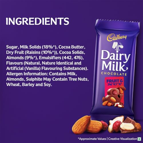 Kuch achha ho jaaye kuch meetha ho jaaye with Cadbury Dairy Milk. Generously made with a glass and a half of milk this Cadbury chocolate comes with the goodness of crunchy nuts & dried raisins. Cadbury Dairy Milk is the perfect meetha for sharing everyday moments of joy with your loved ones. This milk chocolate bar pack is perfect sweet for snacking & storing in the fridge or as a chocolate gift pack for gifting on special occasions like birthdays and get-togethers. Every chocolate bar of Cadbury Dairy Milk is made from 100% sustainably sourced cocoa. It is suitable for vegetarians.