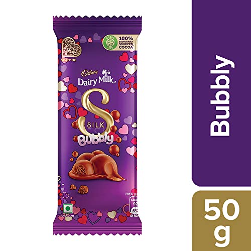 Celebrate this valentine’s day with Cadbury dairy milk silk bubbly valentine pack. Cadbury dairy milk silk bubbly has the same smooth flavour that you would expect from Cadbury’s silk with the added twist of bubbles (completely non-flavour altering). the bubbles simply make it a little bigger to bite into a little airier when you are chewing.