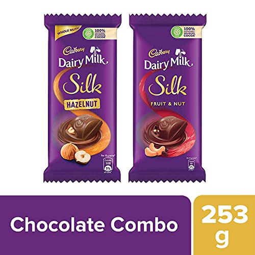 Cadbury Dairy Milk Silk is all about regaling in the chocolate's richness and creaminess. It offers you the reason to celebrate every small and big occasion of happiness. In short indulge in a rich smooth and creamy celebration. This combo comprises 2 packs of Cadbury Dairy Milk Silk Hazelnut 58g & 2 packs of Cadbury Dairy Milk Silk Fruit and Nut 137g.
