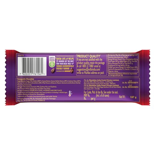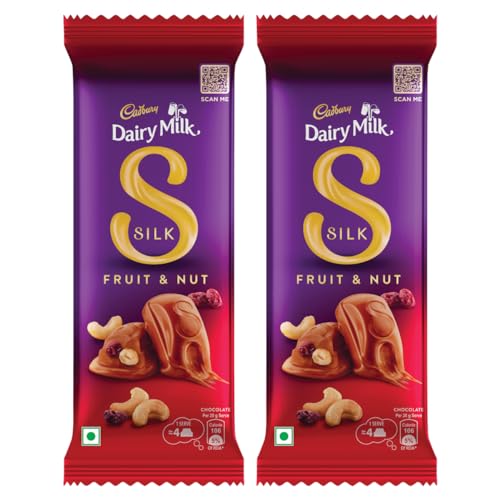 Cadbury Dairy Milk Silk is all about regaling in the richness and creaminess of chocolate. Indulge in a rich smooth and creamy celebration. Silk: The classic taste of Cadbury Dairy Milk chocolates only more creamy more smooth more indulging. Cadbury Dairy Milk Silk Fruit and Nut is made with a glass and a half of milk and offers a delicious combination of combination of creamy milk chocolate and almonds & raisins. This milk chocolate bar is a perfect sweet to indulge in all alone or as a chocolate gift pack for gifting on special occasions like birthdays and get-togethers. Every bar of Cadbury Dairy Milk Silk is made from 100% sustainably sourced cocoa. It is suitable for vegetarians.