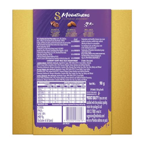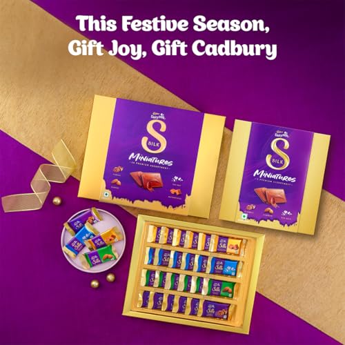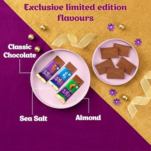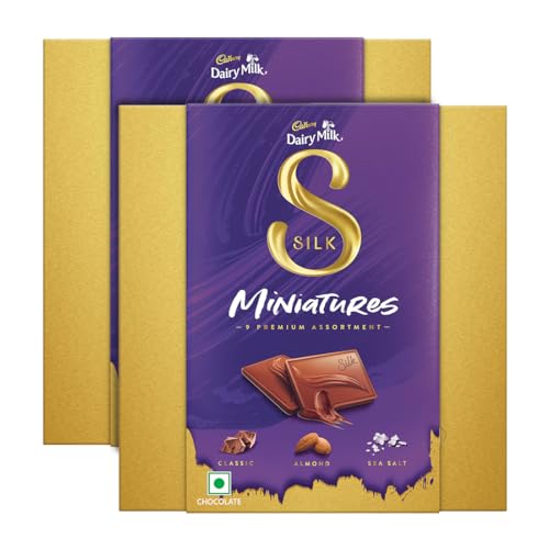 Introducing the indulgent Cadbury Dairy Milk Silk Miniatures an exquisite assortment crafted to elevate your chocolate experience. Each box features a tantalizing selection of three delectable flavors: classic almond and sea salt offering a symphony of taste in every bite. With three pieces of each flavor totalling 9 irresistible mini bars this collection promises to delight your senses and satisfy your cravings. Whether it's a heartfelt Rakhi gift for your sibling a sweet surprise for a loved one's birthday or a festive treat for Diwali spent with family these miniature delights are the perfect way to spread joy and sweetness on any special occasion. Indulge in the luxurious taste of Cadbury Dairy Milk Silk Miniatures and make every moment memorable with a touch of sweetness.
