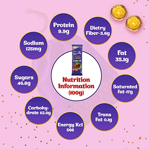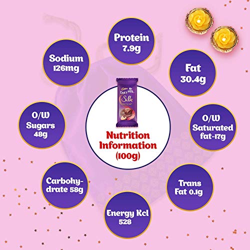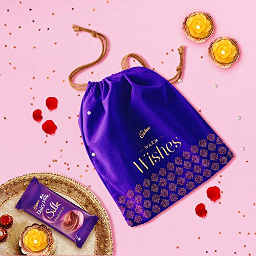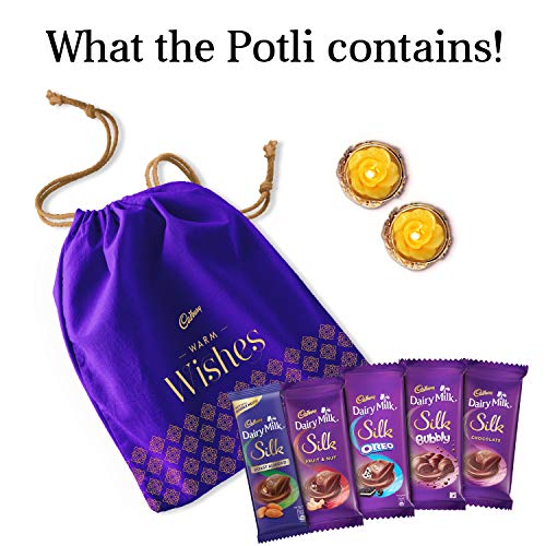 Welcome the festive season with the exclusively designed Cadbury chocolate potli. This Diwali make your loved one's heart melt with the rich taste of silk chocolates. The potli bag has a thick golden drawstring with a knotted end for perfect closure. Lighten up the day of your friends & family by gifting this elegant Diwali silk potli which contains 1 unit of dairy milk silk bubbly 50g 1 unit of dairy milk silk fruit & nut 55g dairy milk silk Oreo 60g dairy milk silk roast almond 58g dairy milk silk chocolate 60g and 2 decorative diyas.