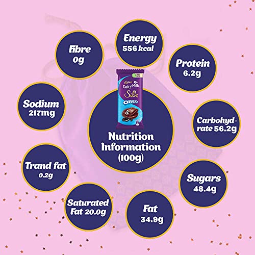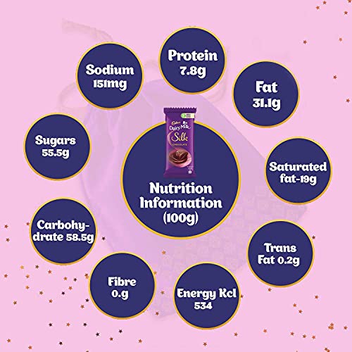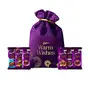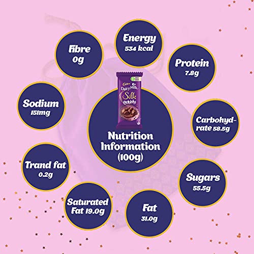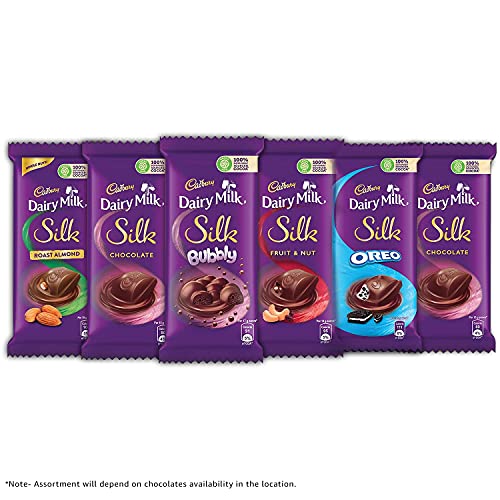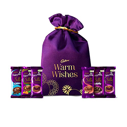 Add excitement and fervour to the traditions of festivals by gifting your friends and family this exclusively designed potli by Cadbury. This potli contains any 6 Cadbury chocolates from the following options -Silk Bubbly 50g Silk Fruit & Nut 55g Silk Roast Almond 58g Silk Oreo 60g and Silk Plain 60g.