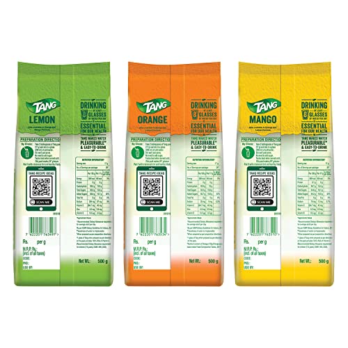 Tang comes in a refreshing mango lemon and orange flavour which keeps everyone refreshed throughout summer. It not just has great fruit taste but also comes with the goodness of vitamins A B C and Iron. A glass (approximately 180ml) of Tang gives your child 60% of Vitamin C required for the entire day. Experience the novelty of summer with the fresh refreshment of Tang instant drink mixes. Contains 1 pack of Tang orange instant drink mix 500g 1 pack of Tang lemon instant drink mix 500g and 1 pack of Tang mango instant drink mix 500g.