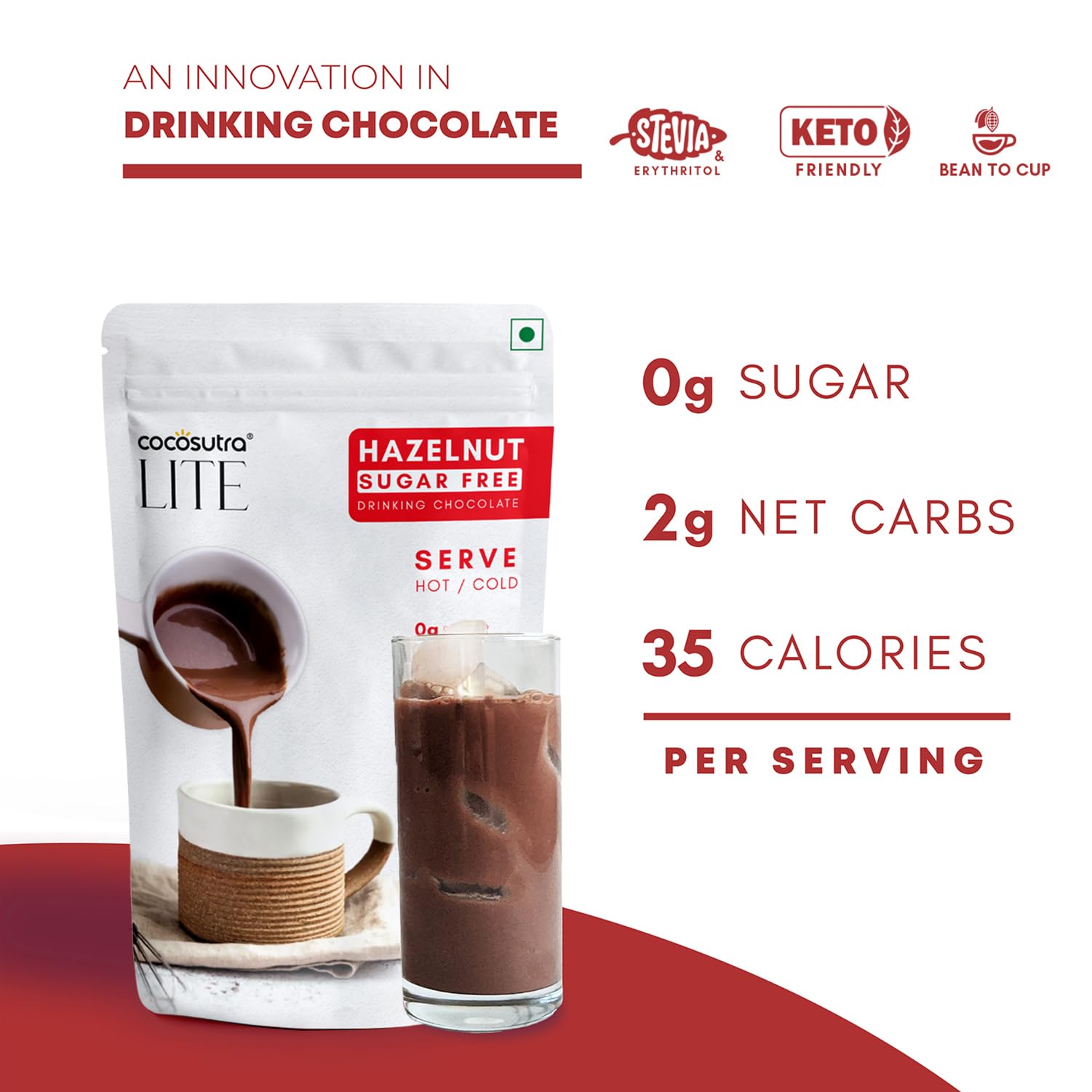 COCOSUTRA SUGAR FREE Drinking Chocolate Mix - Hazelnut | Zero Sugar Low Carb Low Calorie | Stevia & Erythritol based | Keto Friendly Hot Chocolate | Vegan | Enjoy hot or cold | 200 g