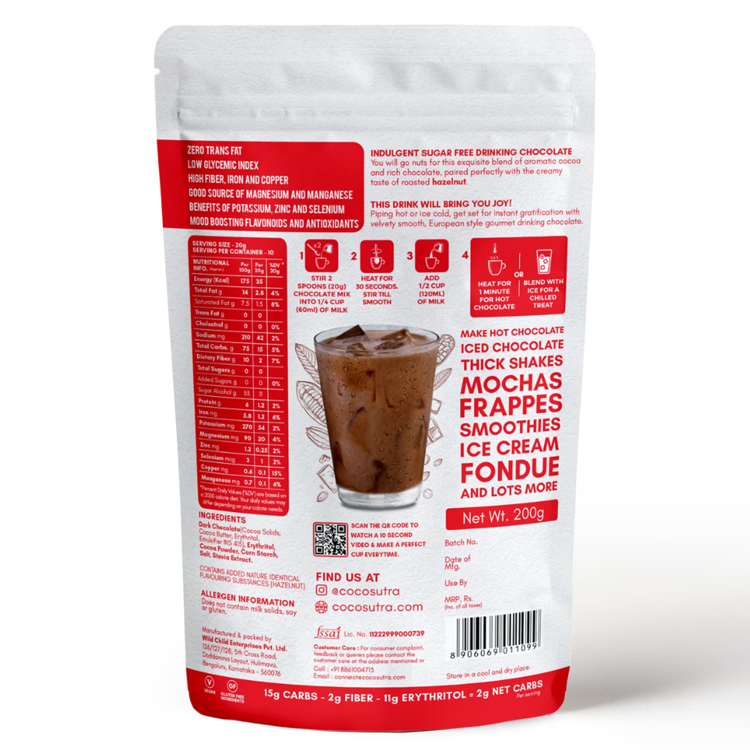 Serving Suggestions: Stir content of Cocosutra SUGAR FREE Drinking Chocolate Mix sachet (20 g) with a splash of milk of choice. Heat for 30 seconds. Stir to form a smooth paste. Blend with ice and 160 ml milk for iced chocolate OR heat with 160 milk for a