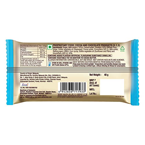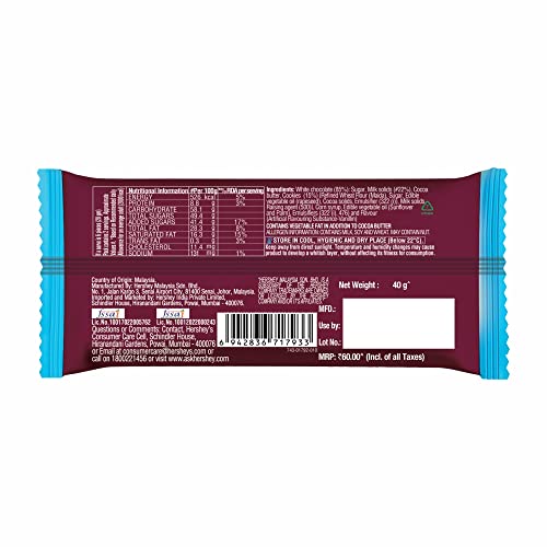 Presenting iconic HERSHEYS American chocolate bar from the house of HERSHEY company. HERSHEYS Milk Chocolate Bar is a flagship chocolate bar manufactured first by The Hershey Company. Hershey refers to it as "The Great American Chocolate Bar. Its a perfect delight for snacking. HERSHEYS Bar are available in India in 3 unique flavors: (1) HERSHEY'S Creamy Milk sets the standard for chocolate bars (2) Cookies n Creame with its creamy texture and cookie bits is indeed a true joy (3) Hersheys Almonds Bar with Whole Roasted California Almonds in simply irresistible and a must try. These smooth creamy indulgent delicious & mouth-watering chocolate bars are a classic treat that all can enjoy. HERSHEYS bars are perfect for using in deserts. They are great as a party favor or stocking stuffer too. Whether you are celebrating with friends family colleagues or spending quality time at home HERSHEYS Bars can be your perfect partner. These delights can be delightful gifts too for various gifting occasions. These chocolate bars are individually wrapped with quality standards & utmost safety protocols. Perfect for keeping on hand at home or the office. Sweeten up any day at home outdoor school or the workplace with HERSHEY'S smooth creamy chocolate bars!! Try HERSHEYS bars today. HERSHEYS bar are now available in India in 3 delightful flavors in 2 pack sizes. 40g trial pack and 100g packs. Go pick your favorite HERSHEYS bar today.