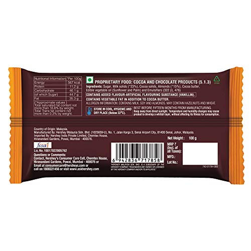 HERSHEY'S Whole Almonds Bar | A Crunchy Chocolaty Treat 100 Gram - Pack Of 2