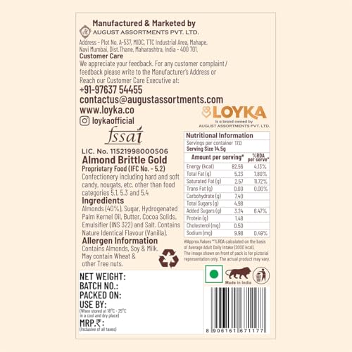 High-quality ingredients : Loyka's Almond Brittle is made with premium quality fresh roasted california almonds (45%) dark choco salty caramel coffee (coffee variant) & brownie (brownie variant). A few simple ingredients for a delicious nutty taste.
